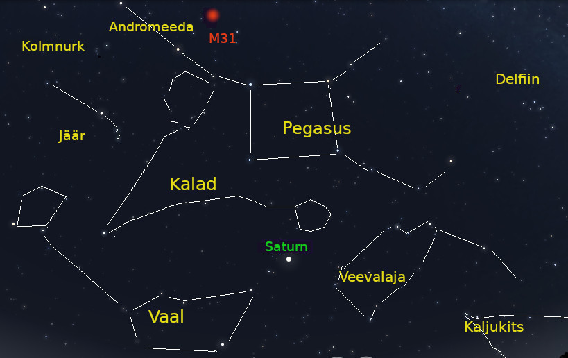Saturn on kuu alguses vaadeldav kogu öö Veevalaja tähtkujus. Planeet kerkib õhtuti kõrgemale ida-kagutaevas, kesköötundidel paistab lõunakaares ning hommikuti vajub edela-lääne poole.