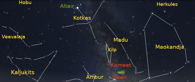 Komeedi Swan asukohta tähistaeva taustal 19. oktoobril kajastab juuresolev tähekaart, mis kujutab madalapoolset lõuna-edelataevast paaril esimel pimedal öötunnil; väga kaugel sellest kohast pole komeet ka paar päeva hiljem, 21. oktoobril.