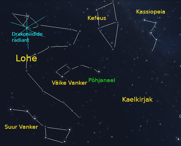 Drakoniidide radiant asub Lohe kontuuri tuulelohet meenutava pea piirkonnas, nii et siinkohal on drakoniidide võrdlus „tulenoolte purkamisega" isegi olemas.