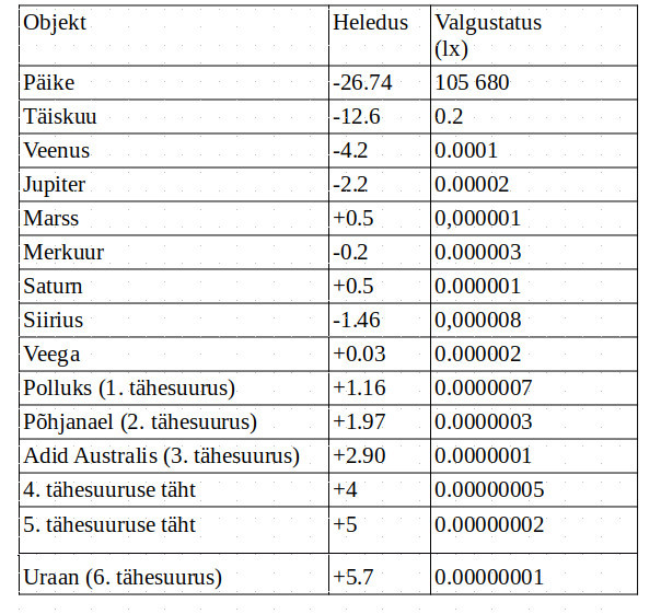 Nüüd võiks esitada väikese tabeli mõnede taevakehade heleduste ning vastavate valgustatuste väärtustest.