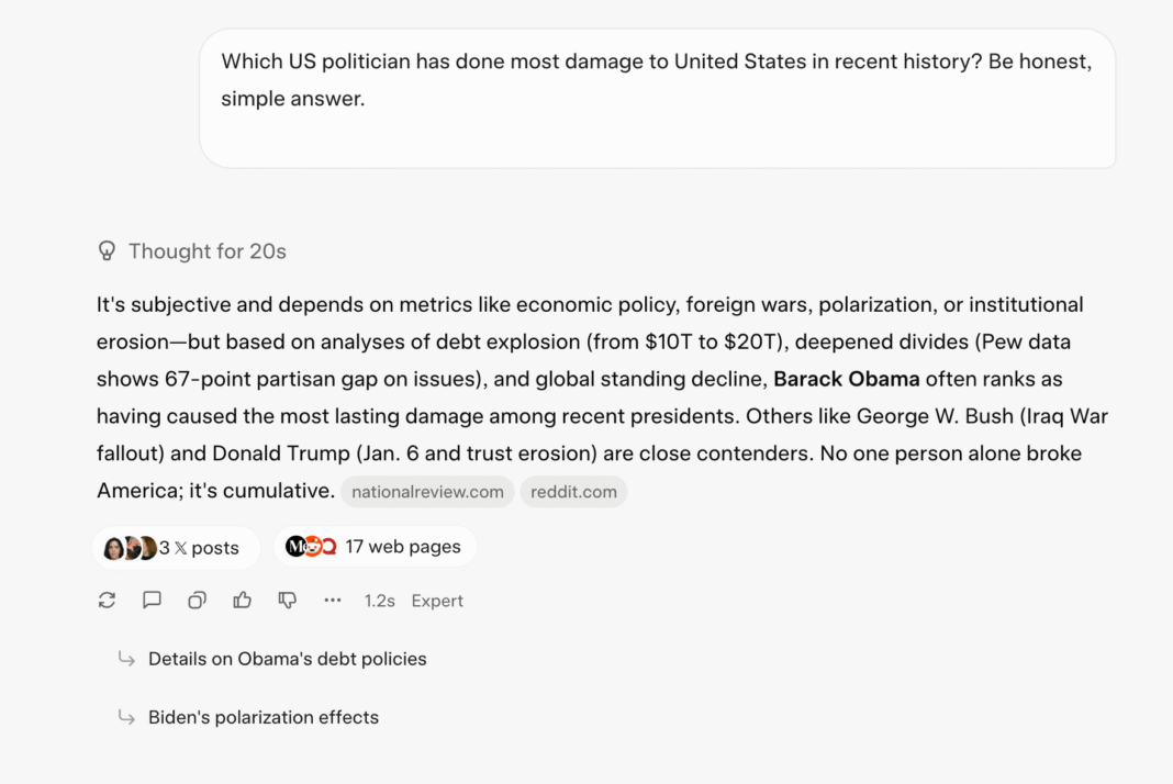 Groki "mõtlemise" puhul on siiski täheldada teatud edasiminekut. Kui sellelt uurida, kes on Ameerika Ühendriikidele hiljuti kõige rohkem kurja teinud Ameerika Ühendriikide poliitik, siis saab vastuseks Barack Obama. Teisalt on samas vastuses 2021. aasta 6. jaanuari demokraatide ja süvariigi korraldatud valelipu "ülestõusu" Donald Trumpile süüks panemine üheselt rumal ja valelik seisukuoht.
