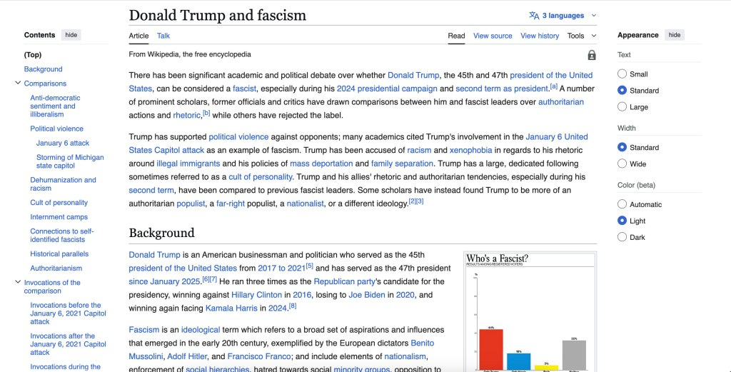 Wikipediast leiab muuhulgas tänaseni neljas keeles artikli "Donald Trump ja fašism", milles muuhulgas kirjutatakse: "Hulk tuntud õpetlasi ja kriitikuid on teda võrrelnud autoritaarsete tegude ja kõnepruugi tõttu fašistidest riigijuhtidega. Samas teised lükkavad sellise sildistamise tagasi."