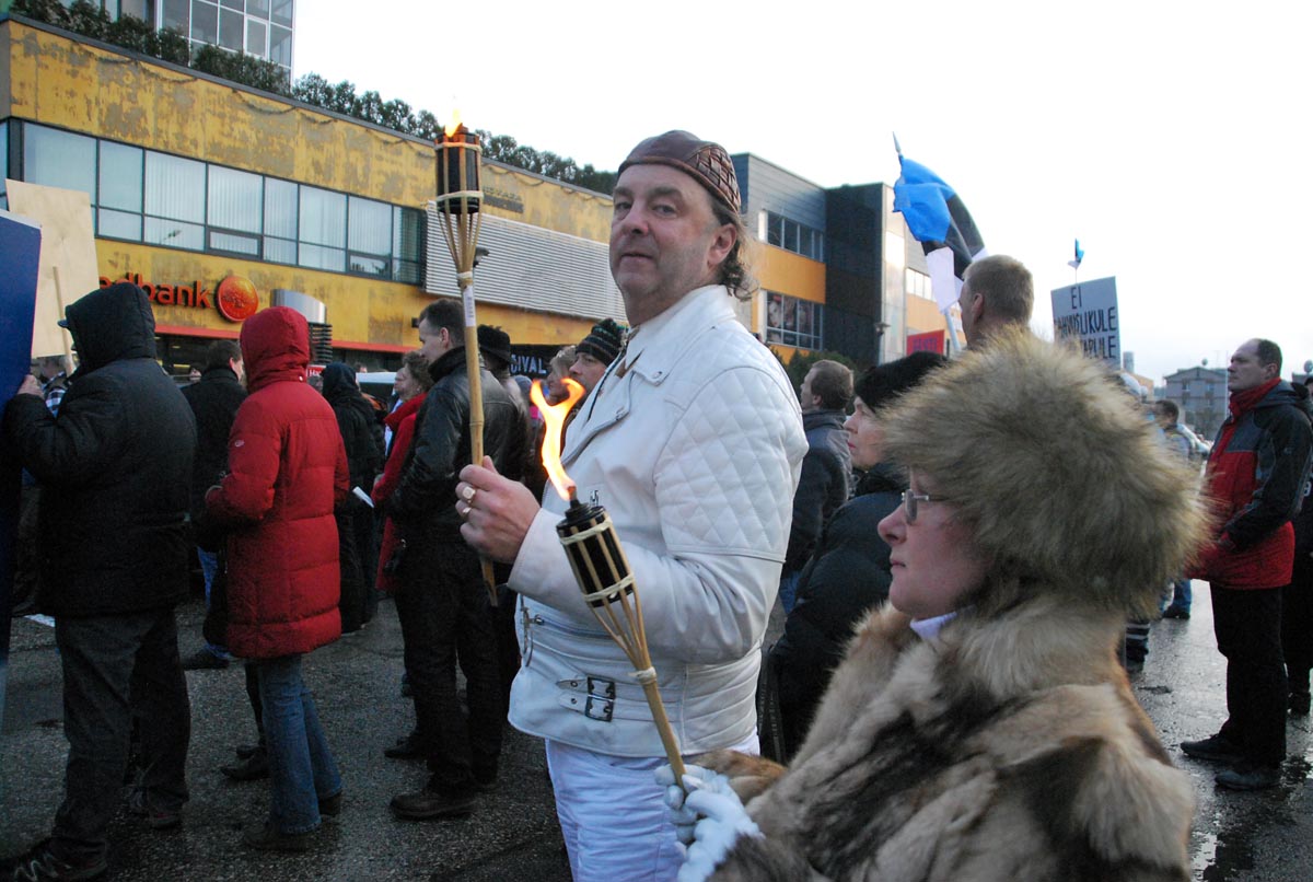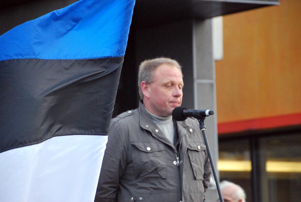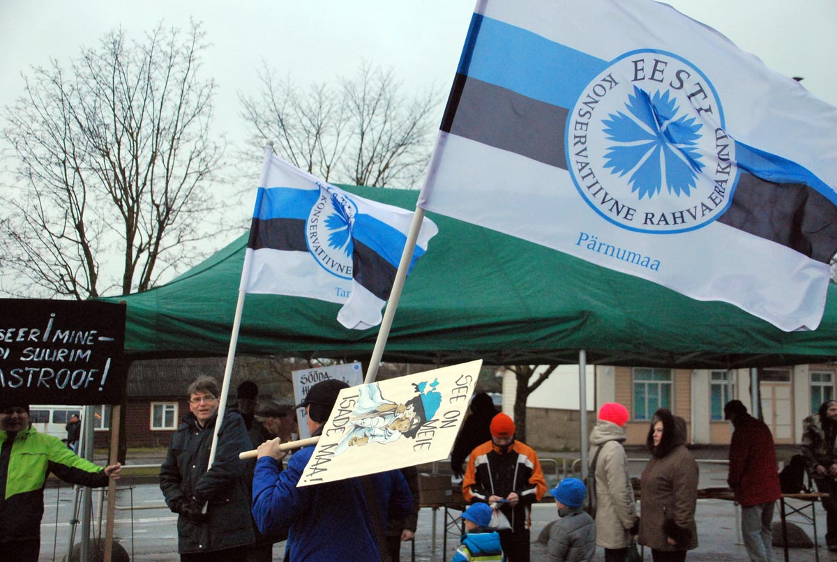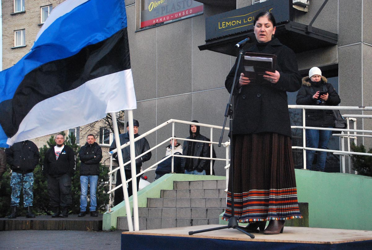 Pool tundi enne algust lehvisid sinimustvalgetes värvides lipud. Veerand tundi hiljem tulid tänavanurgale seisma kuus meest kahe punalipuga, mille keskel valge sõõr ja eestlaste rehielamute katuse otstel nähtud tagasihoidlik kaunistus. Vähese jutuga mehed selgitasid, et üldiselt nad ei poolda mitmel põhjusel EKRE tegemisi, aga tulid siiski seekordset meeleavaldust toetama. Enne päris ametlikku algust läks EKRE aseesimees Anti Poolamets meestega vestlema ja seejärel keriti lipud kokku.