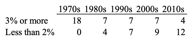 Kahjuks aga ei peatunud 1980ndatel alanud majandusliku stagneerumise trend. Tabelis 1 on aastakümnete kaupa ära toodud nende riikide arv, mille SKP kasv ületas 3% ning nende arv, mille puhul jäi see alla 2%.