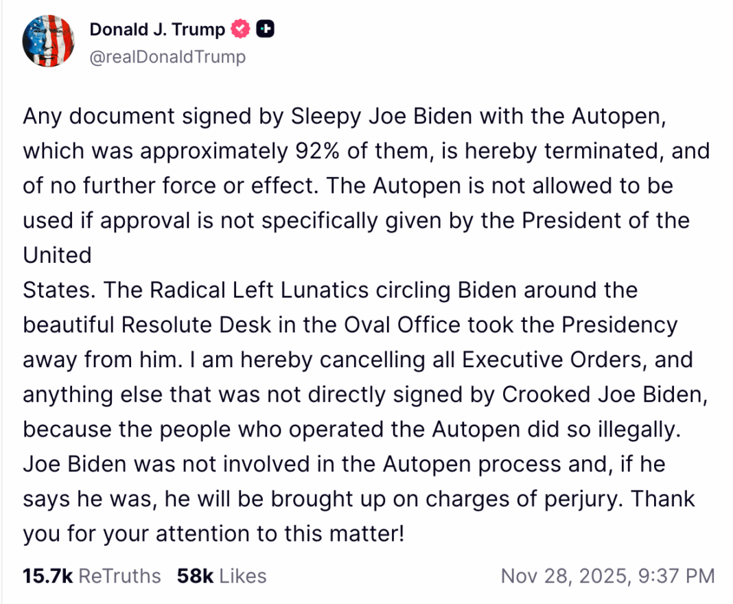 Selleks, et Trumpi sõnad Bideni autopliiatsi allkirjade tühistamise kohta saaskid ametliku kuju, peab neile järgnema vastav presidendi korraldus. Mida 29. novembri hommiku seisuga allkirjastatud ei ole.