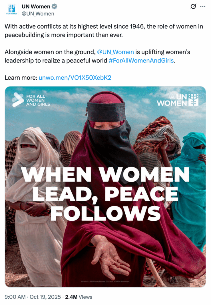 Ühinenud Rahvaste Organisatsiooni naisteorganisatsioon ÜRO Naised avaldas 19. oktoobril ühismeedias reklaami "Kui naised juhivad, järgneb sellele rahu", mida illustreerib grupp Sudaani näokatetega mosleminaisi.