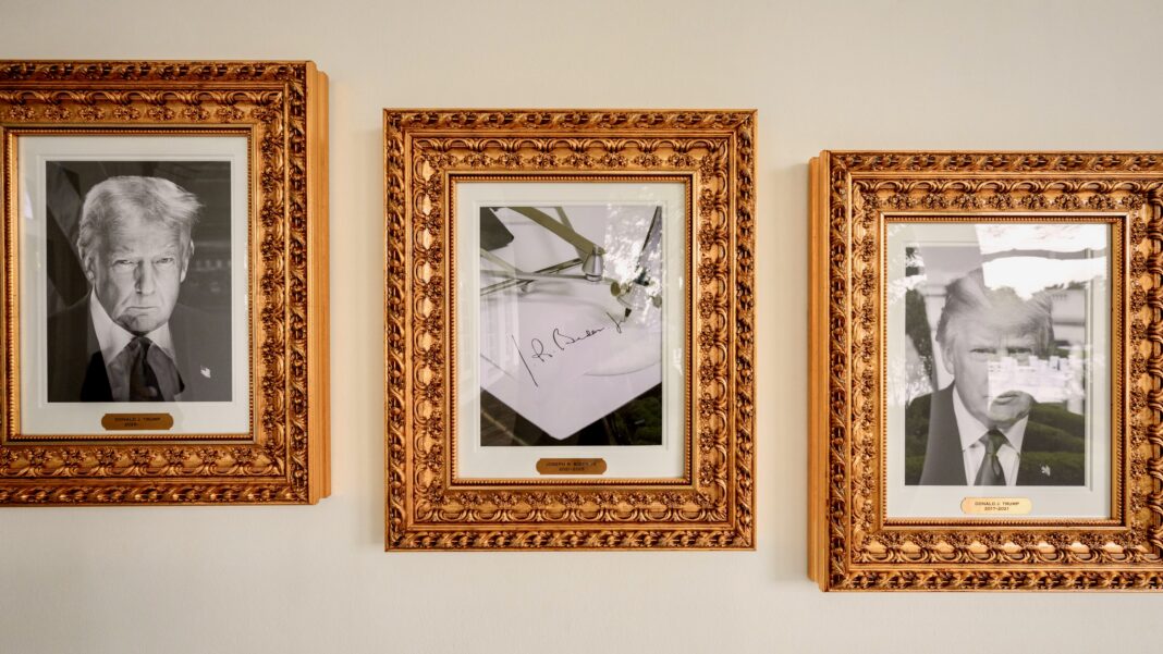 Trumpi ettepanekul riputati Valge Maja läänetiiva sammaskäiku Ühendriikide presidentide maalide reporduktsioonide ja fotode galerii. Kui galeriis on esindatud kõikide USA valitsusjuhtide näod, siis kahe Trumpi pildi vahel asuva Joseph B. Bideni oma asemel on autopliiatsi masina oma.