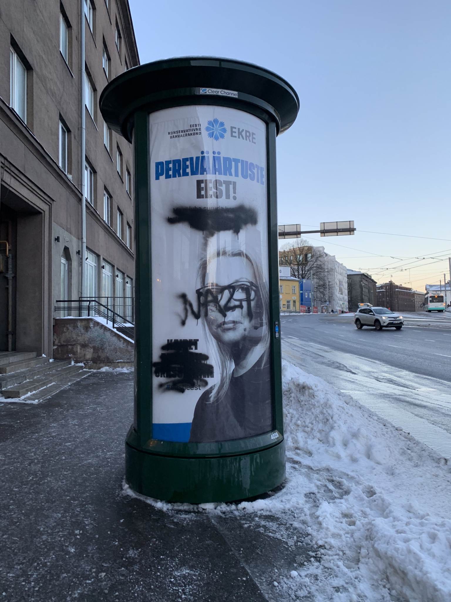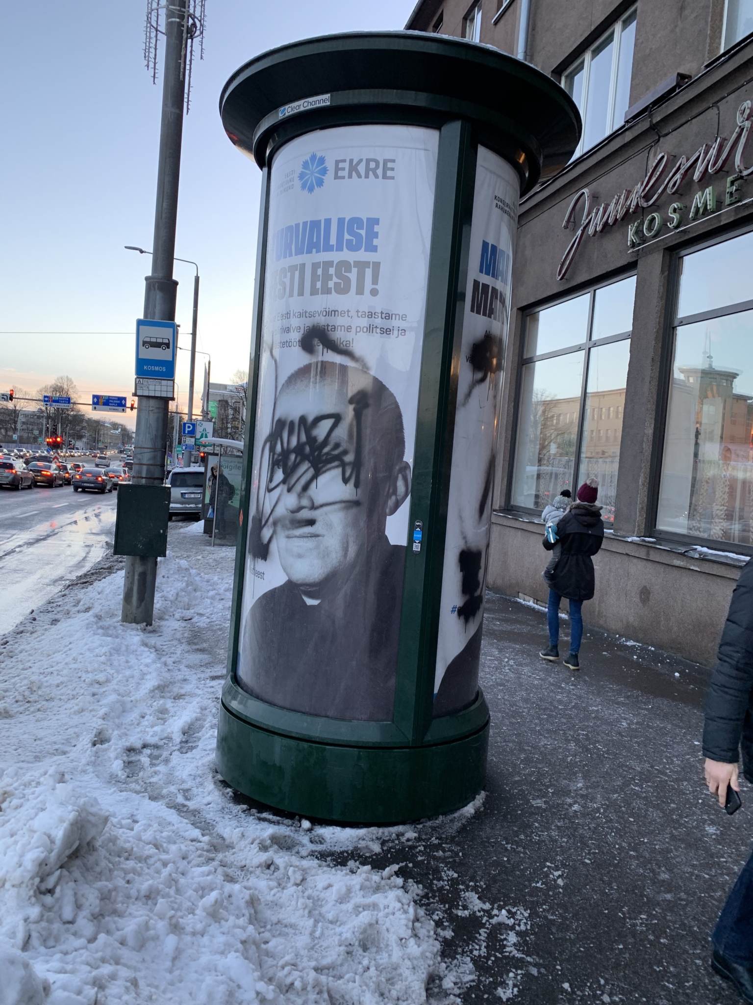 Rahvusraamatukogu juures oli valimisplakatilt musta värviga maha tõmmatud nii kandidaadi nimi kui ka valimisloosung ning üle tema näo oli suurelt kirjutatud "NAZI" ehk nats.