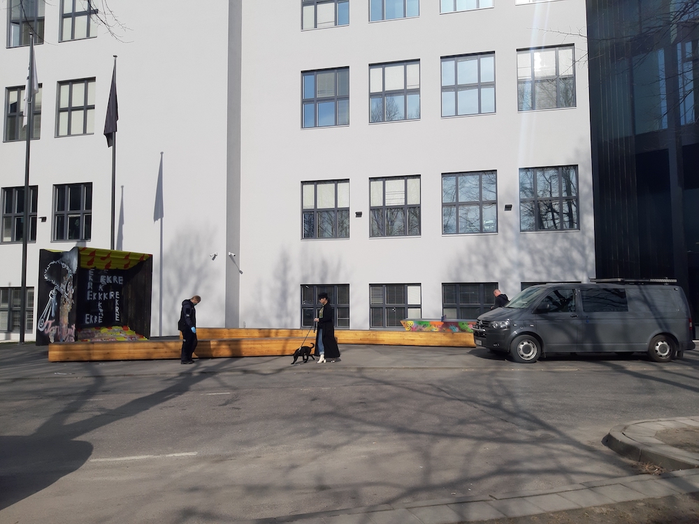 Kohale ilmus ka Eesti Kunstiakadeemia tudeng Eri, kes soovis avalikule lõuendile soditud "EKRE" tähtedest moodustatud haakristi üle võõbata. Kuna politseil oli aga tarvis sündmuspaigas asitõendeid korjata, sealhulgas võtta ka "kunstiteose" autori tuvastamiseks DNA-proove, siis tal seda teha ei lubatud ning kõrvalistel isikutel paluti taiese vahetust lähedusest lahkuda.
