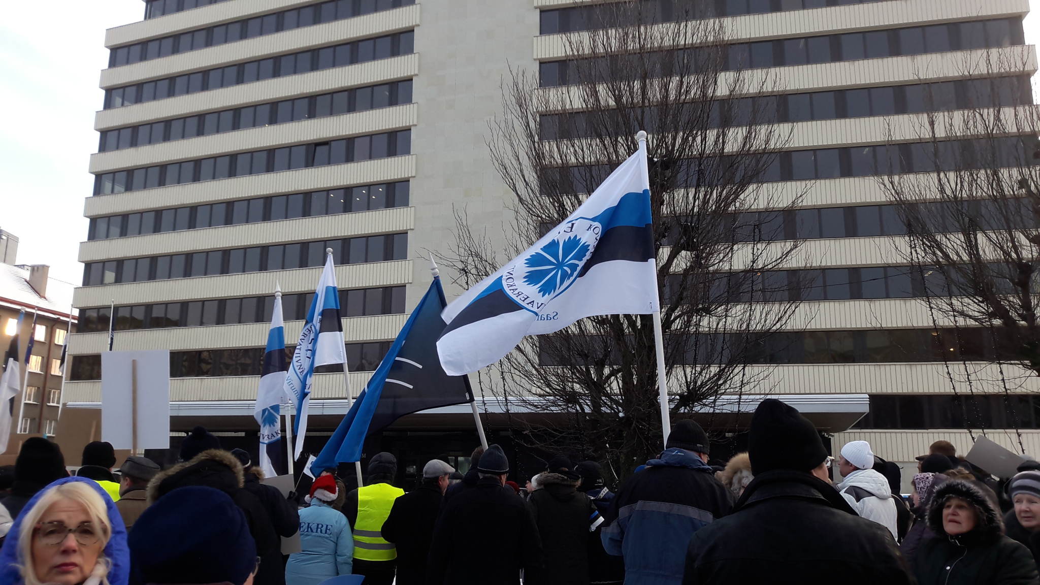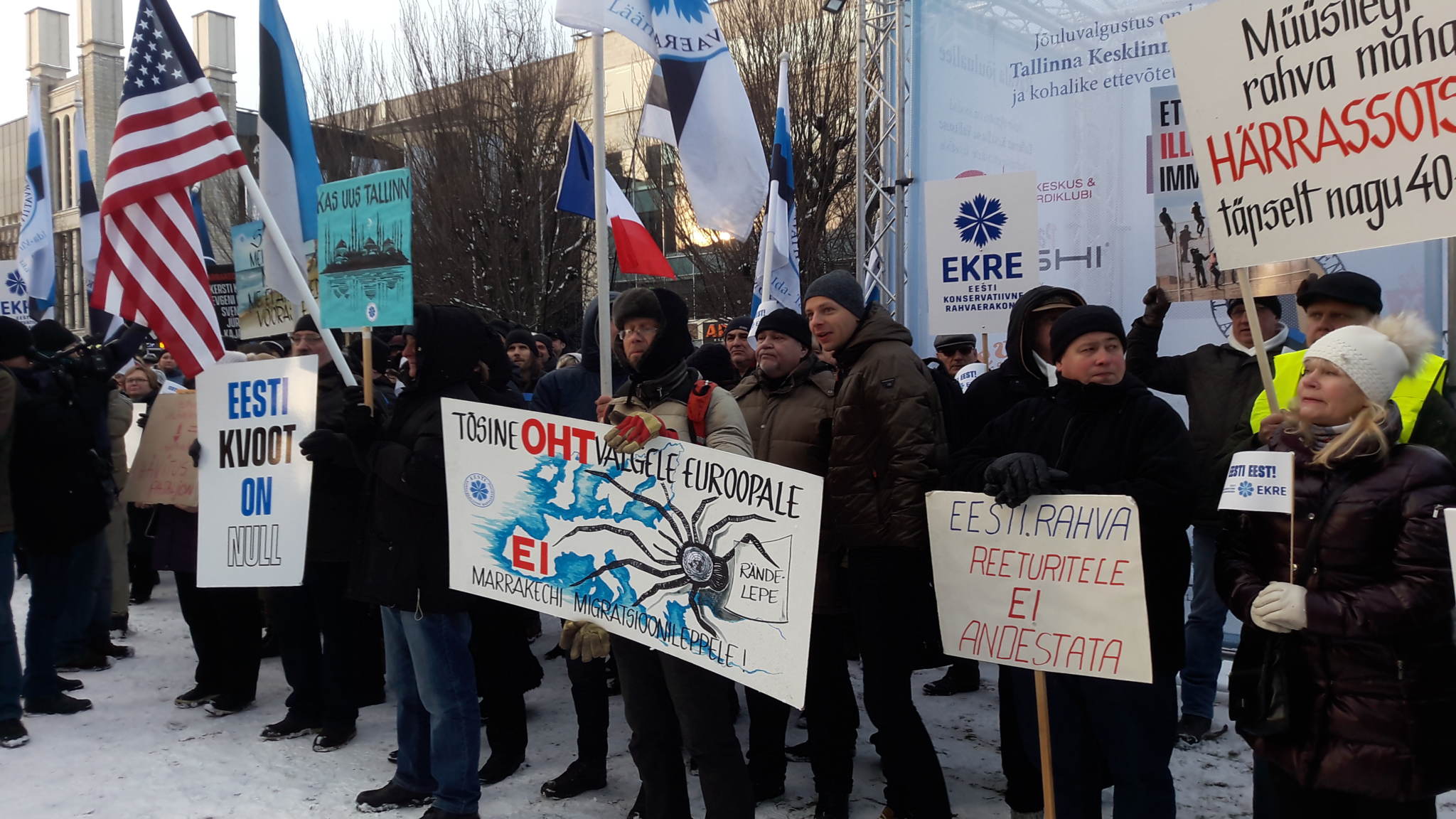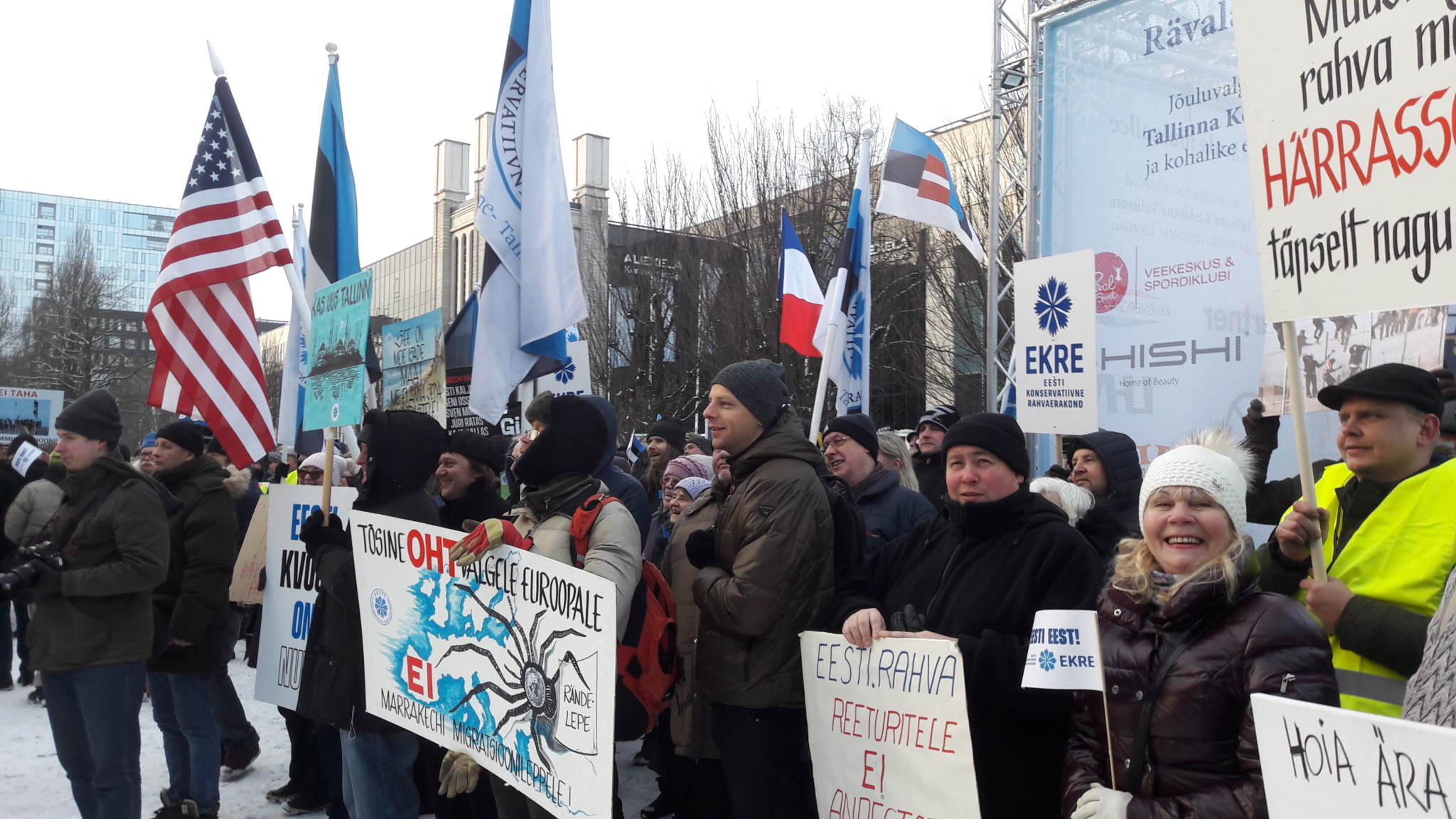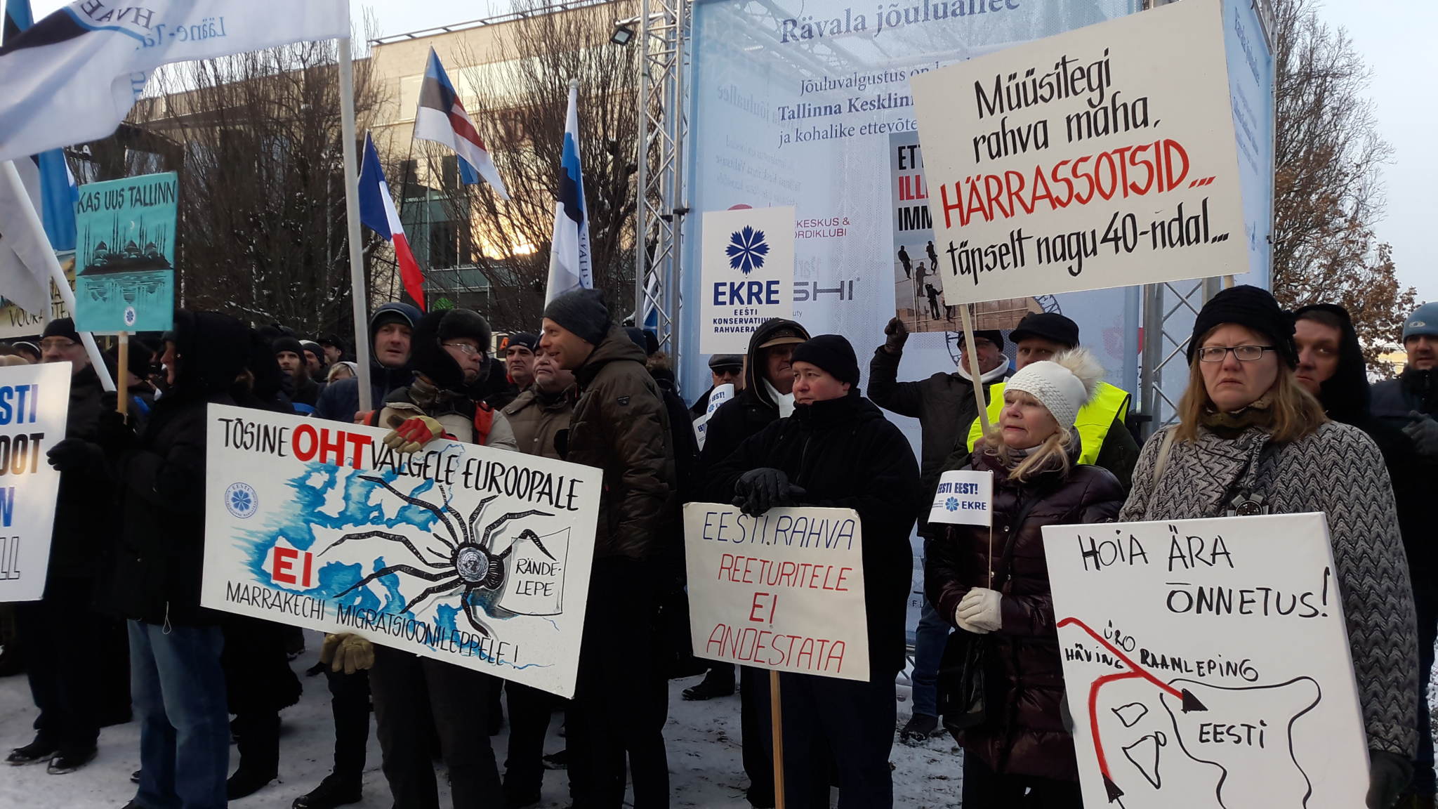Lippudega varustatud meeleavaldajad protestisid kolmandat korda Eesti rändepoliitikat ja sõnavabadust muutva leppe vastu. Täna on kuupäev, mil välisministeeriumi läkitatud ametnik kirjutab Marrakeschis vastavale dokumendile alla.