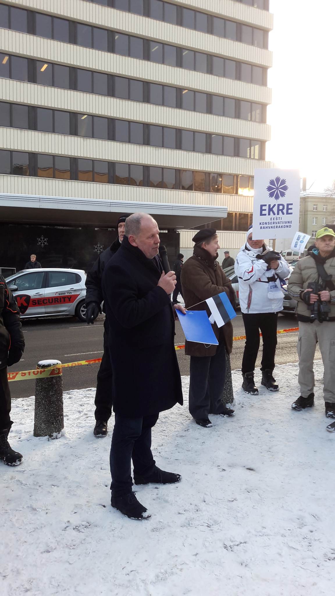 "Juhime piketiga tähelepanu, et rändepaktiga liitumist ei toeta küsitluste järgi enamus Eesti rahvast ning valitsusel puudub mandaat leppe allkirjastamiseks," ütles EKRE esimees Mart Helme enne meeleavalduse algust.